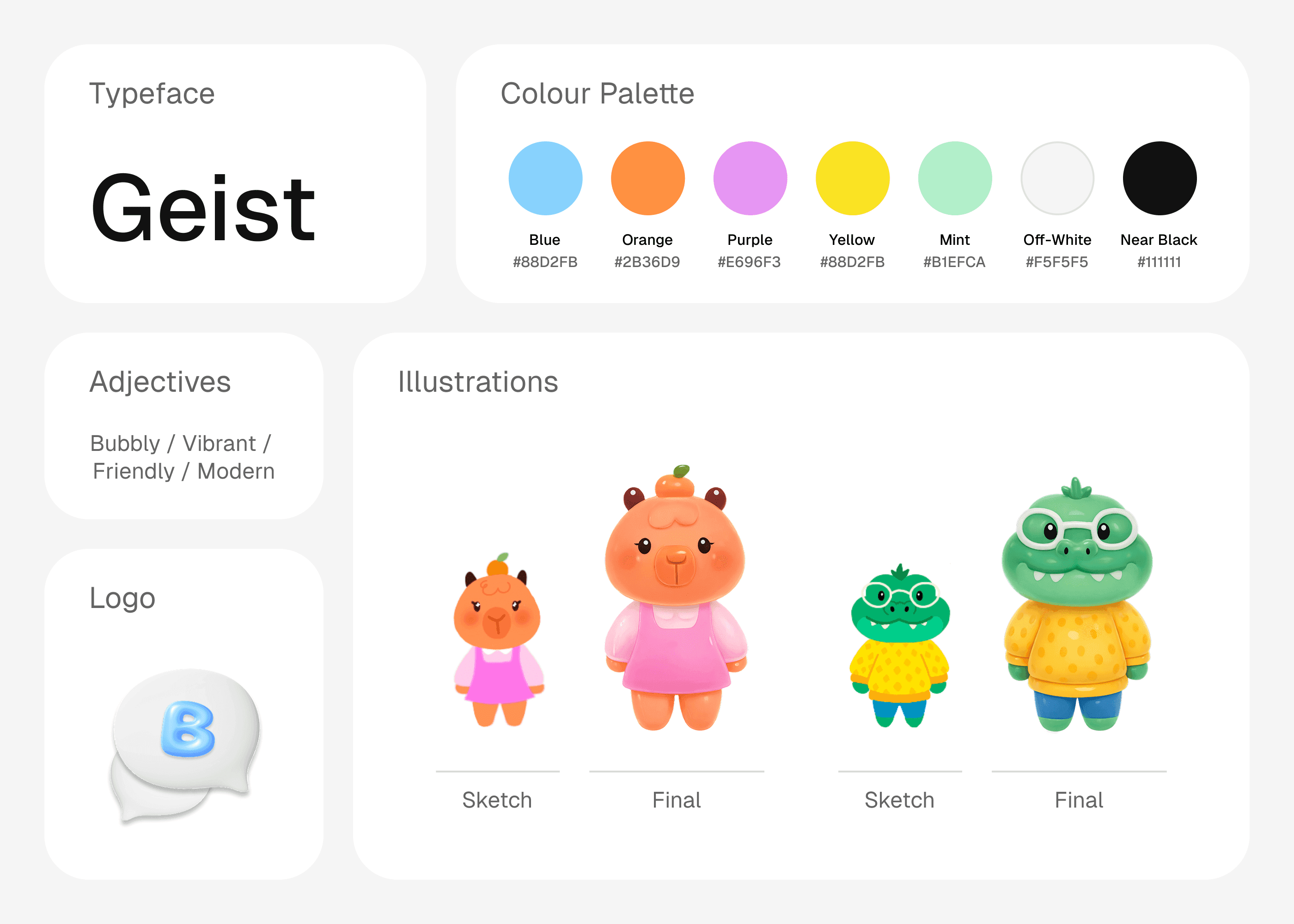 We kept branding lightweight to keep the sprint focussed on research and UX. A quick moodboard helped align us early on a visual direction with a bright, colourful palette that felt fun, welcoming, and modern. I also hand-drew the mascots, then transferred them to ChatGPT to apply a soft, bubbly texture that matched the logo and overall “bubbly” vibe.