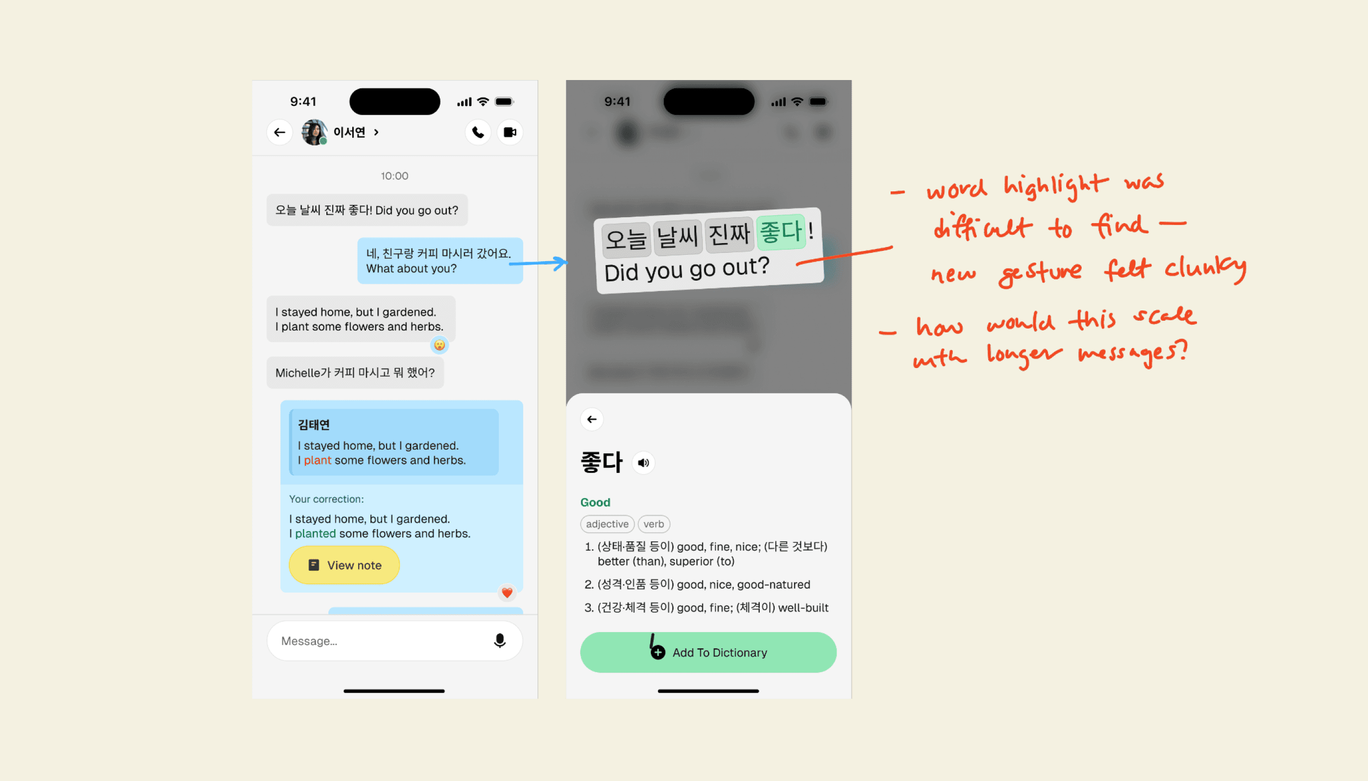 Supporting research ³ ⁴ shows personalized learning environments significantly boost motivation in educational contexts. So rather than embedding an assistant into live conversations, I designed a progress dashboard that visualizes improvement over time, and (with explicit consent from users) offers personalized review exercises based on aggregated mistakes. By focussing on overall patterns instead of individual exchanges, we created a natural motivational flywheel.