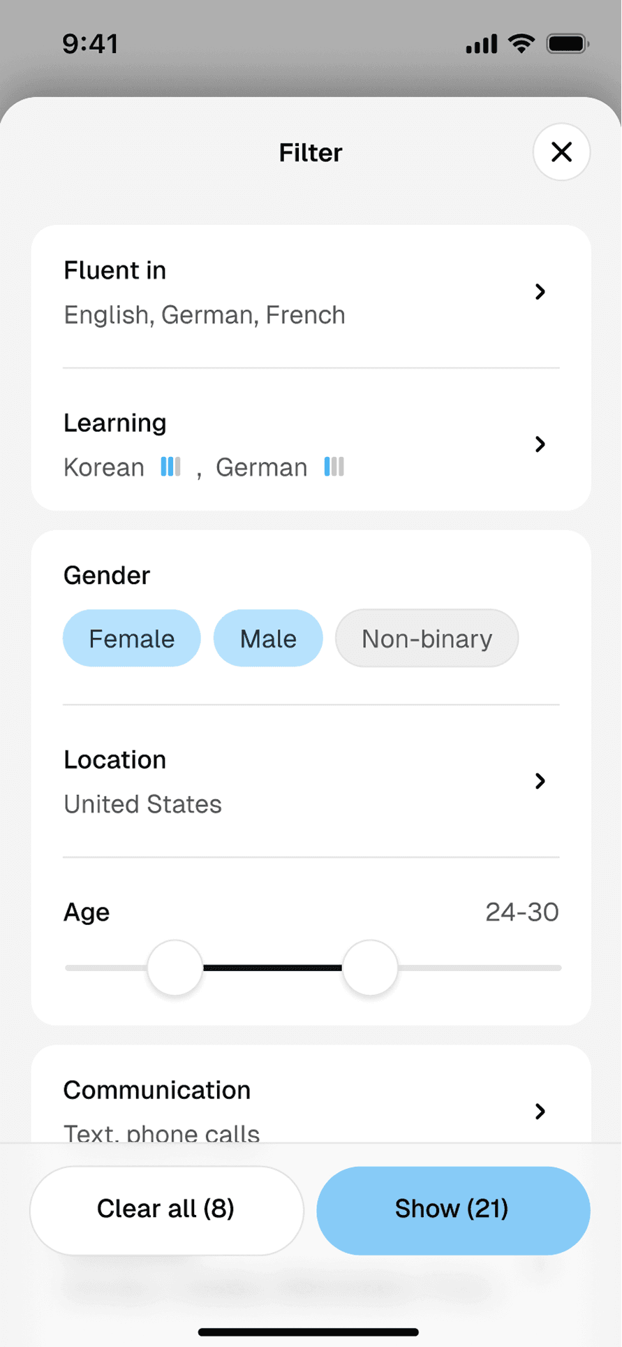 A thoughtful matching algorithm and filters helps surface profiles with shared interests, goals, communication styles, and desired timezones and proficiency levels. Profile cards are designed larger for slower, thoughtful browsing and contain visual indicators of compatibility to reduce decision fatigue and encourage meaningful conversations.