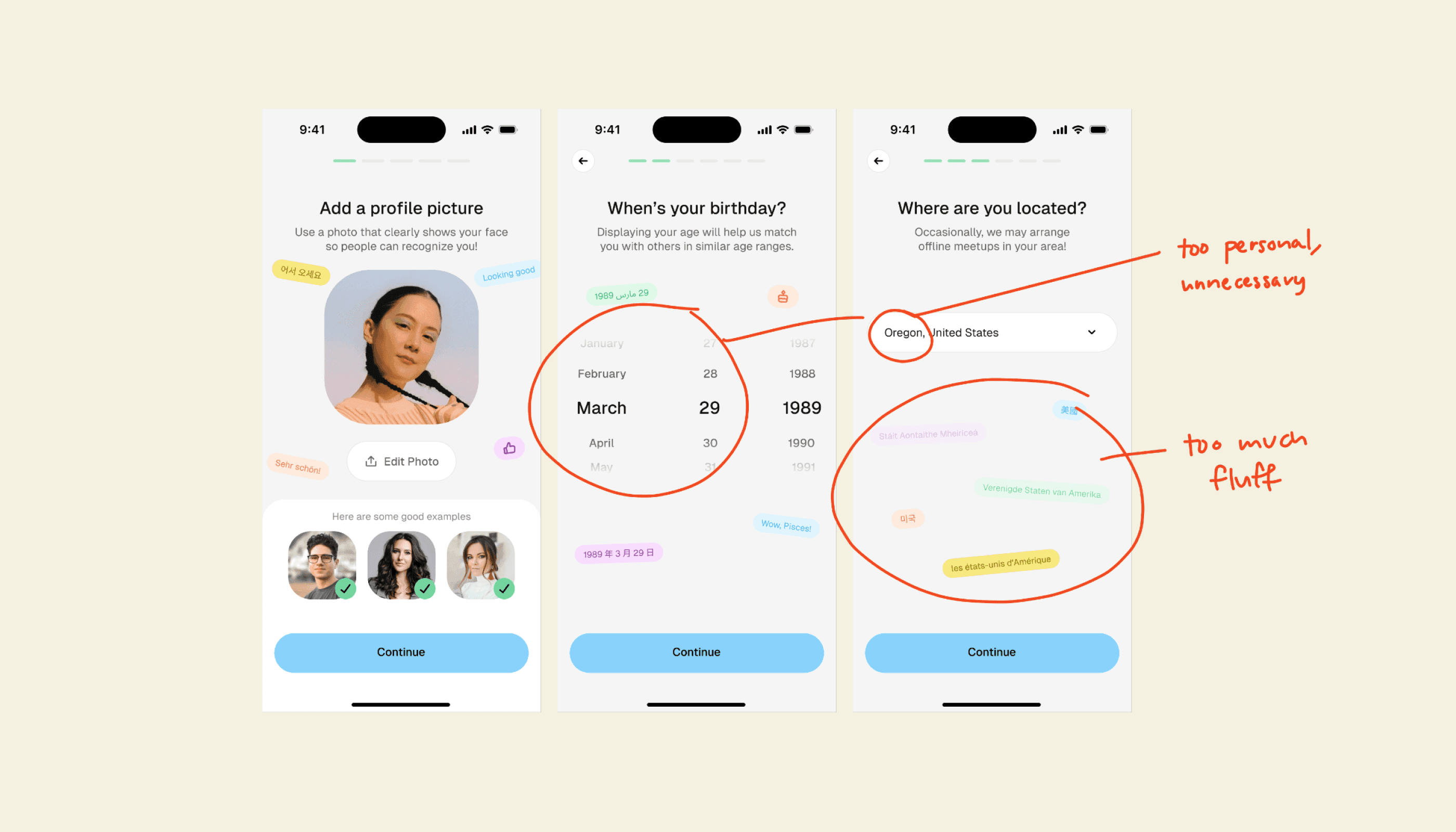 Bubble’s onboarding balances gathering only essential information for quality matches, while respecting user privacy. Playful visuals making the process feel engaging rather than tedious, and a waitlist at the end builds community trust through manual human review.