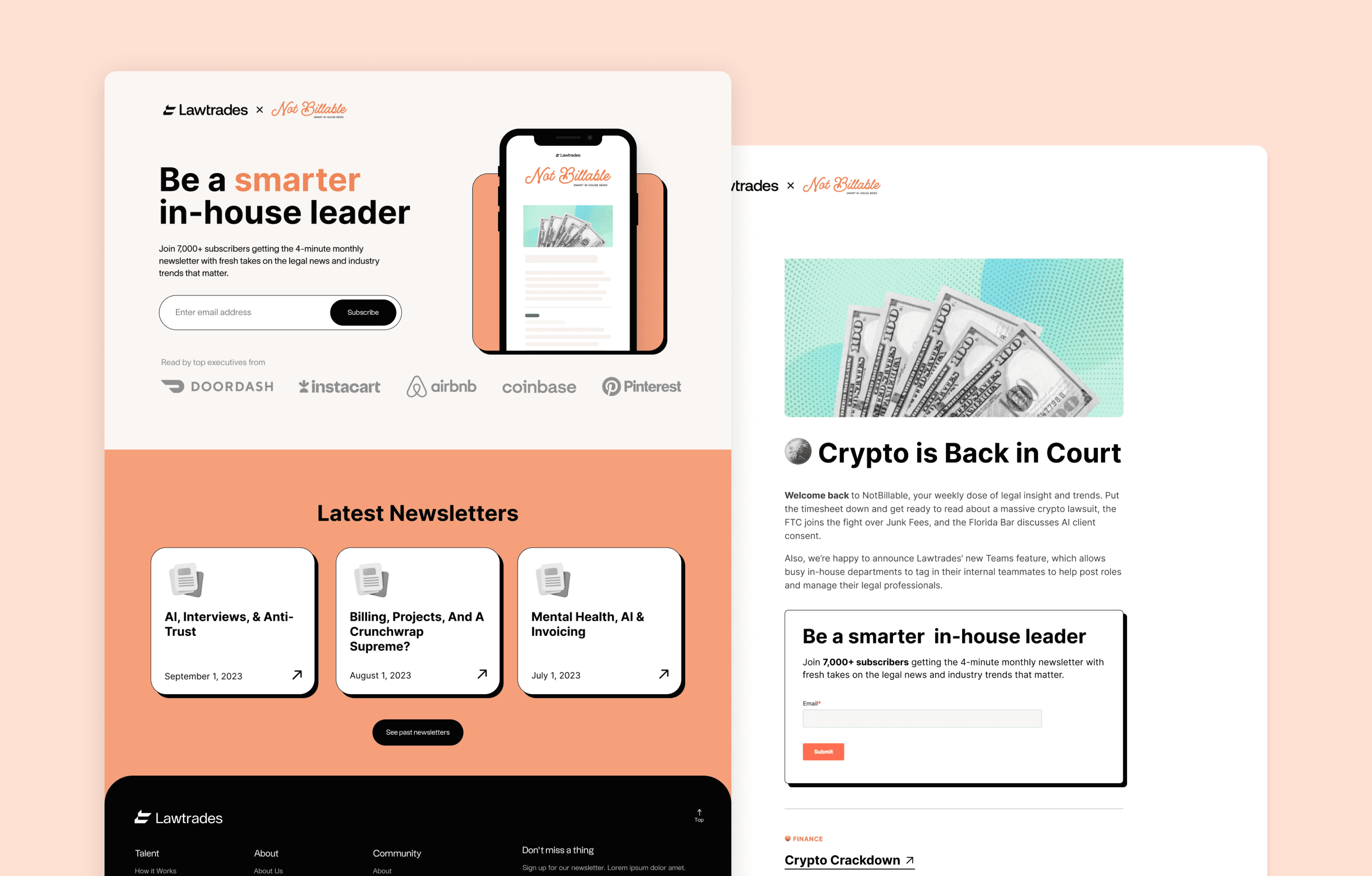 In collaboration with another designer, I designed a sub-brand identity for Lawtrades' digital talent newsletter, Not Billable. Deliverables included a logo, landing page, email templates and blog headers. The goal was to create something distinct yet still recognizable to the main brand, so we: