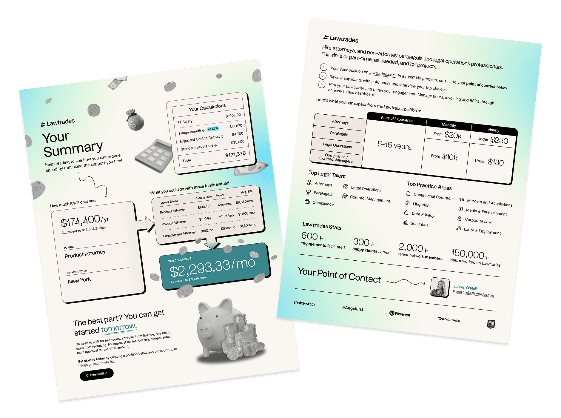 The cost savings calculator helps hiring teams realize potential savings by comparing full-time legal costs to Lawtrades' flexible freelance talent pool. Under the direction of the co-founder, I led the design of the interface, user flows and downloadable PDF, then partnered with a developer to ensure accurate functionality.