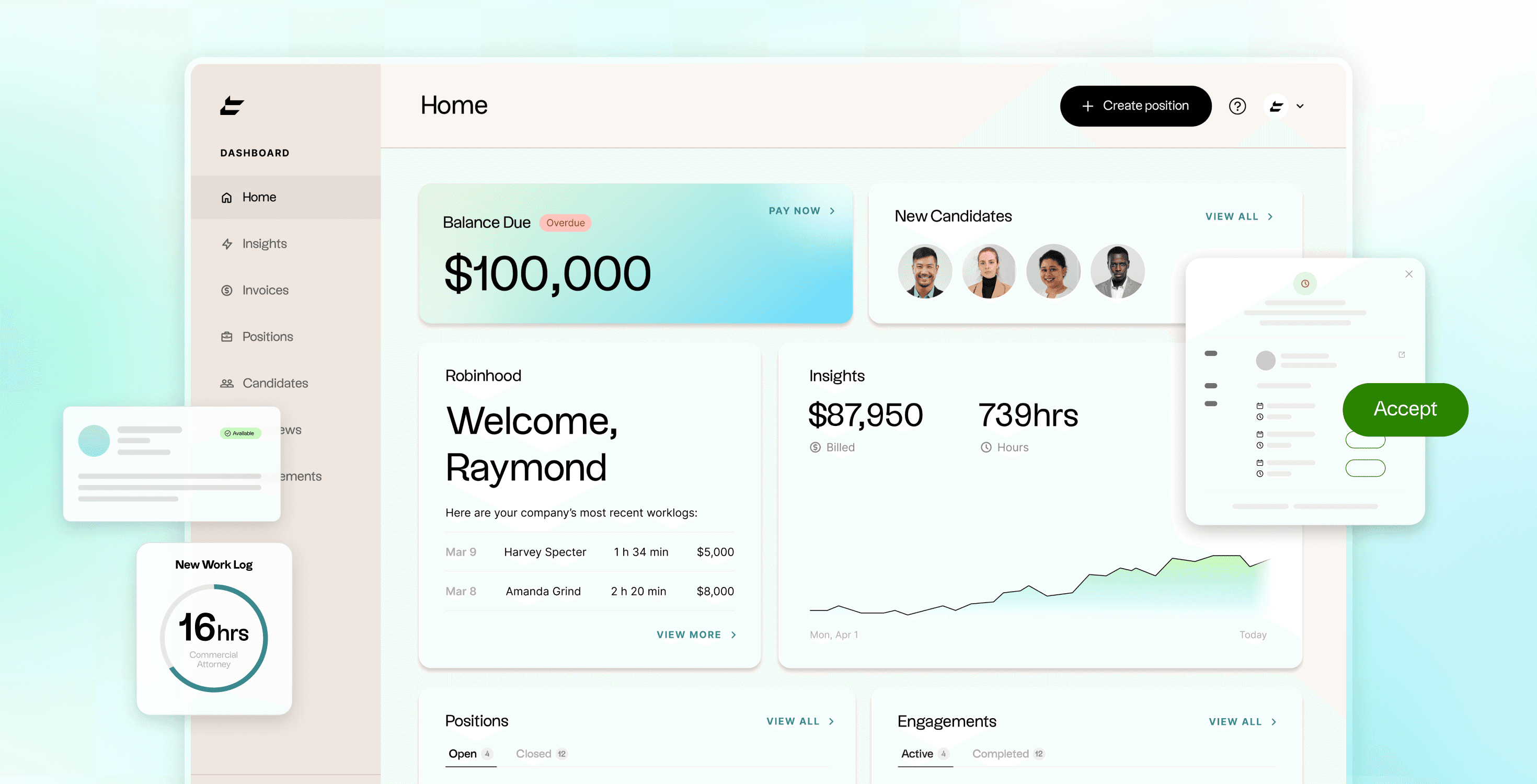 Introduced a home dashboard for clients to improve navigation and flow with relevant widgets. This update streamlined the hiring experience on Lawtrades, allowing at-a-glance insights into important tasks like outstanding balance, candidates to interview, accumulated insights, and open positions/engagements.