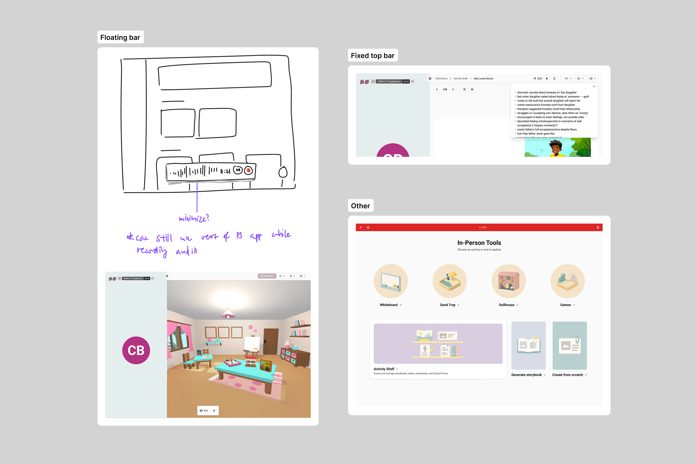 We had identified two potential user types: practitioners using PlaySpace as their primary EHR, and practitioners using PlaySpace alongside their own primary EHR. Because of this, I considered multiple entry points so our note-taking tool could adapt to fit different practices.