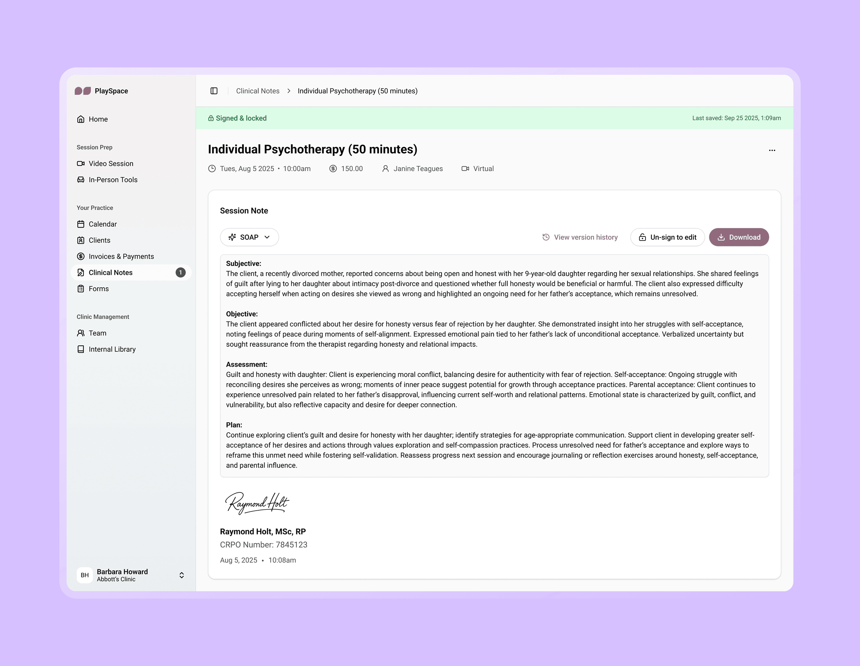 Incomplete session notes must be signed and locked with the practitioners’ signature, full name, credentials, and date and time.