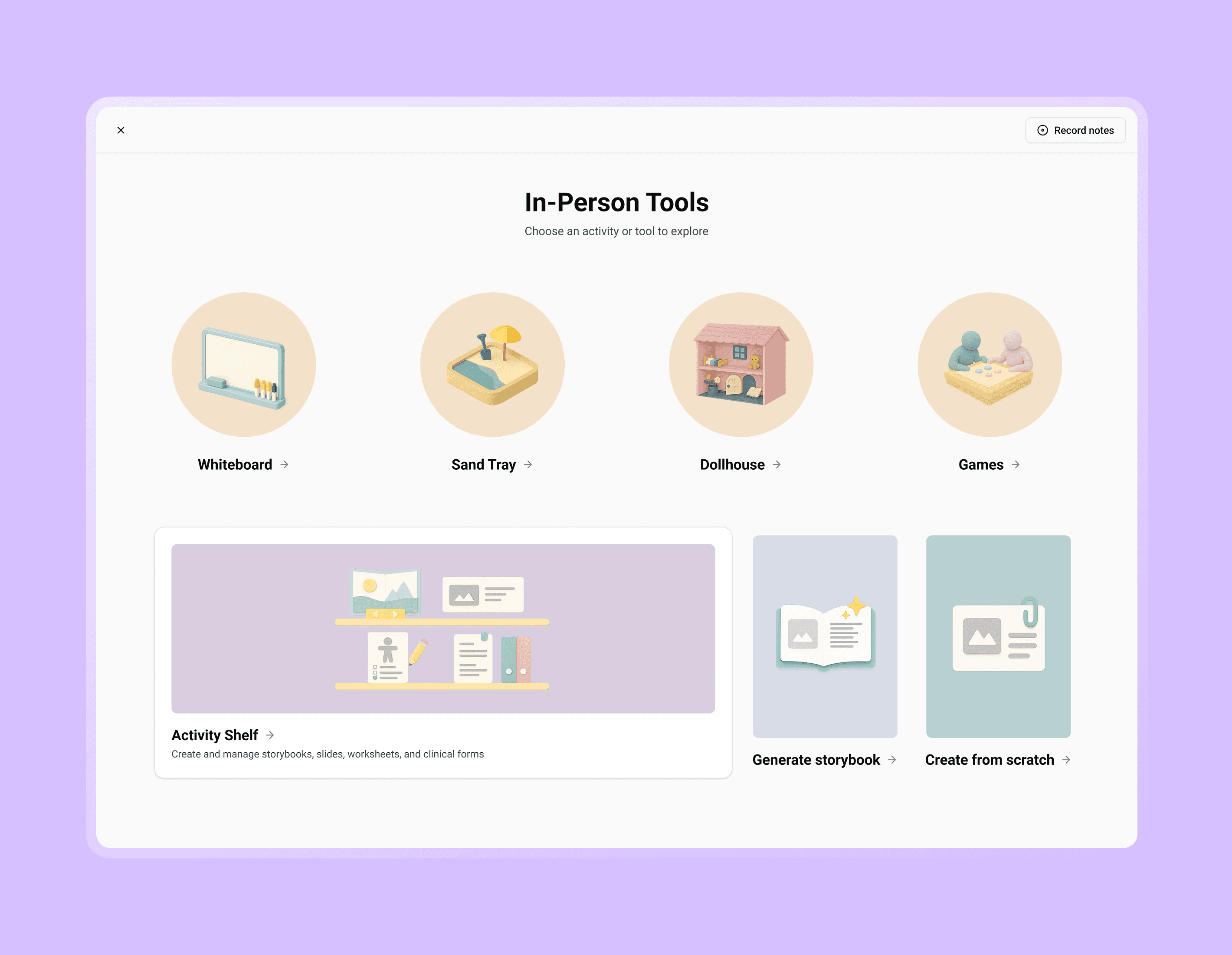 The quick notes interface is particularly designed to fit on the side, ensuring uninterrupted access to therapeutic tools and the client’s face.