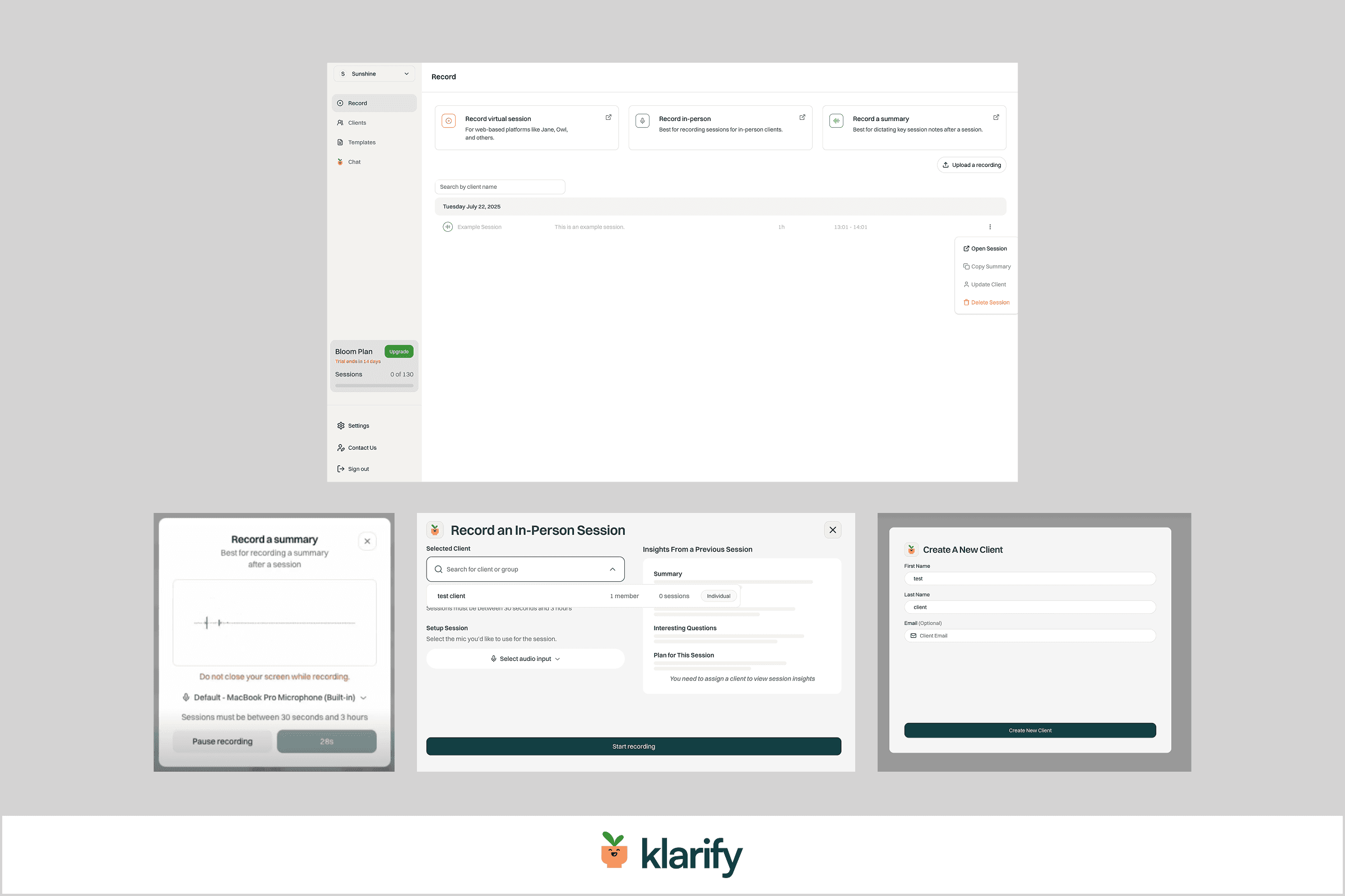 Support both in-person and virtual session recording without disrupting client care