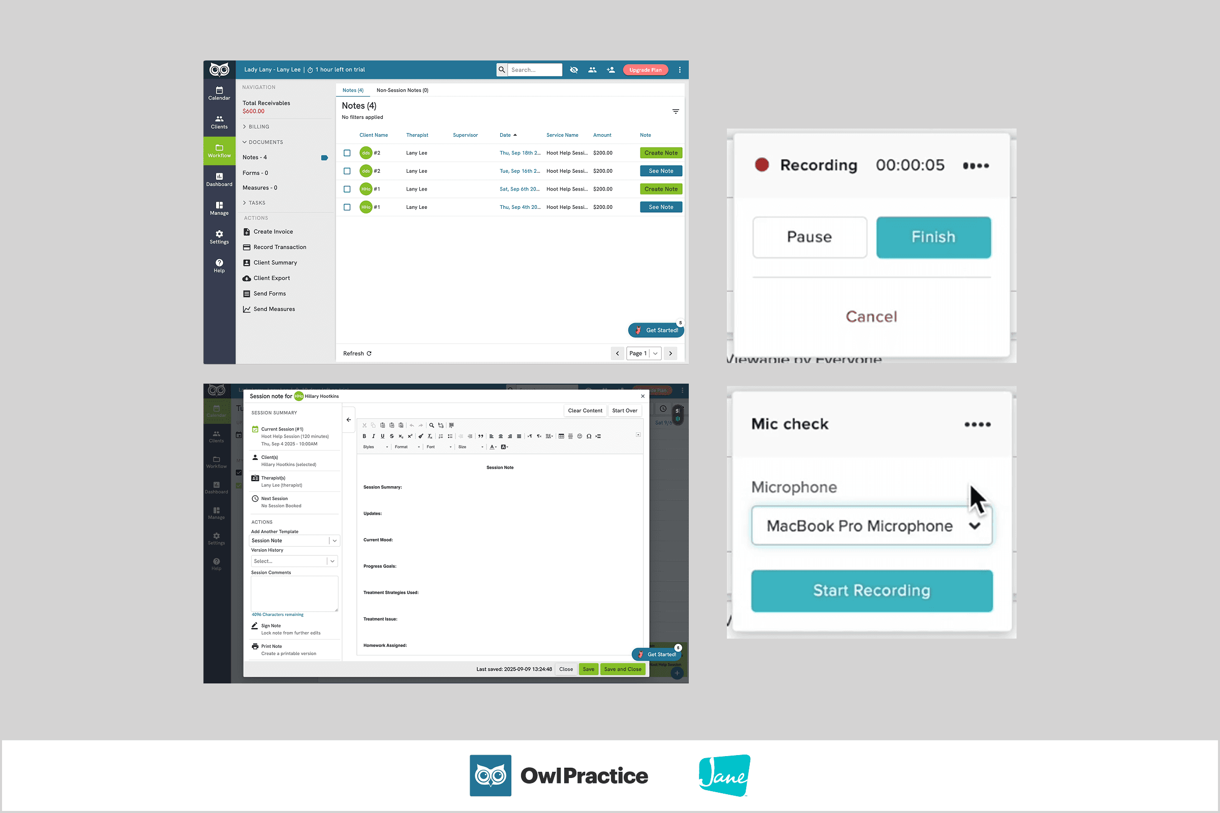 In a virtual session, practitioners can choose between taking notes without recording, or recording with quick notes — both options exist to give practitioners a sense of true ownership over their notes.